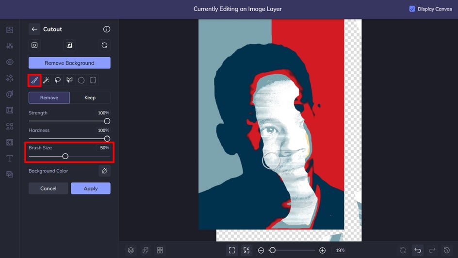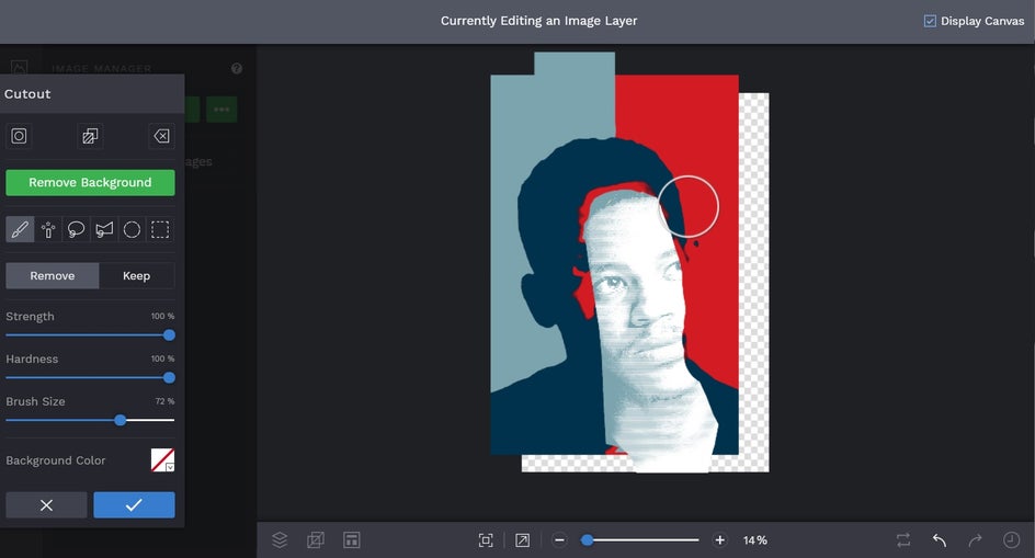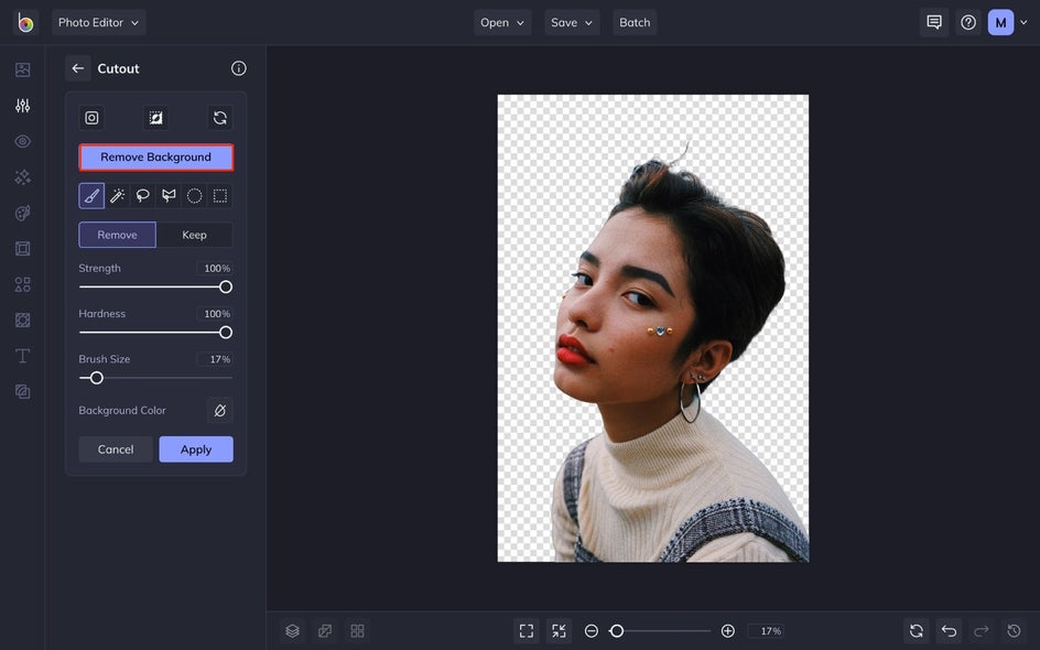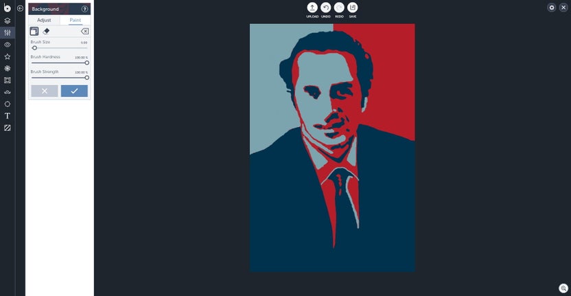 Click the Remove Background Button for instant results. The various brushes and settings allow you to adjust and customize the final look.