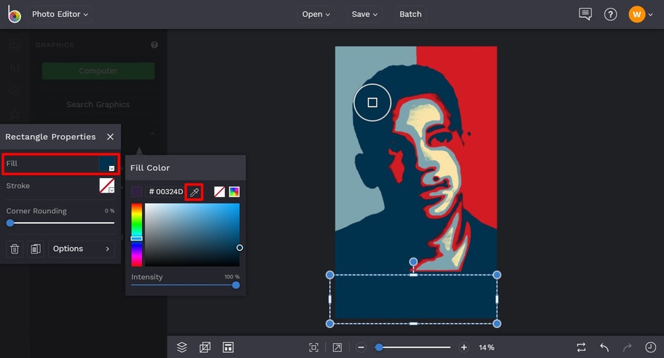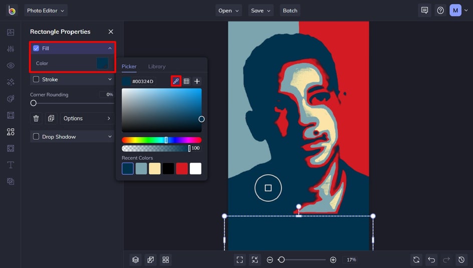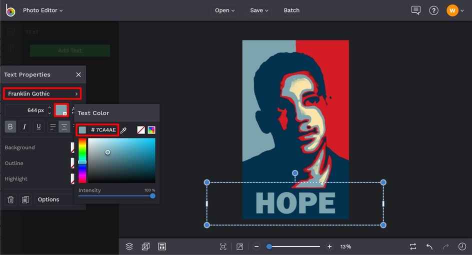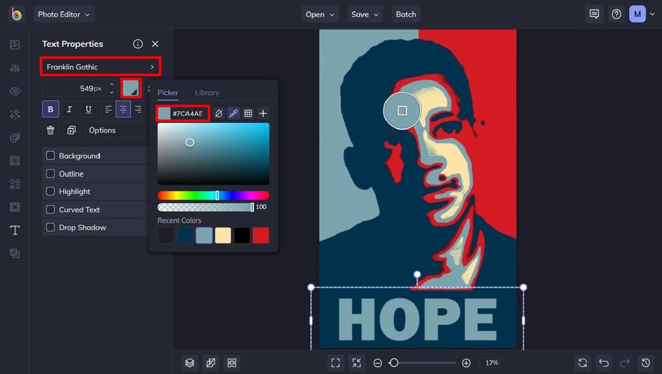 From the Text Properties tab, select your favorite font. ("Gotham" is the font used in the original poster.) Additionally, you can use the Eye Dropper Tool to select the light blue hue already present in your image, to further aid Shepard Fairey’s original street art-inspired design.