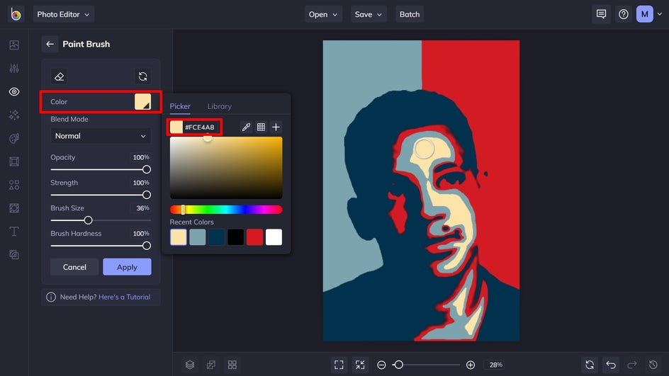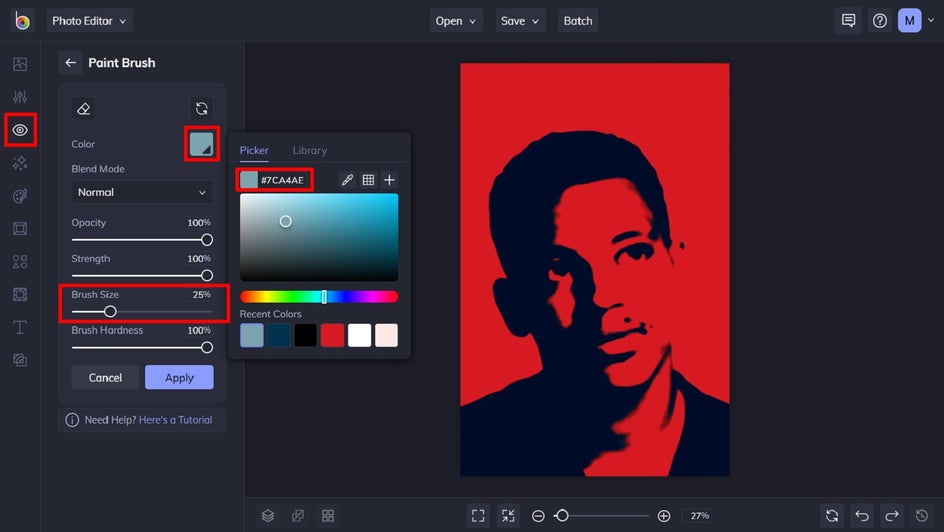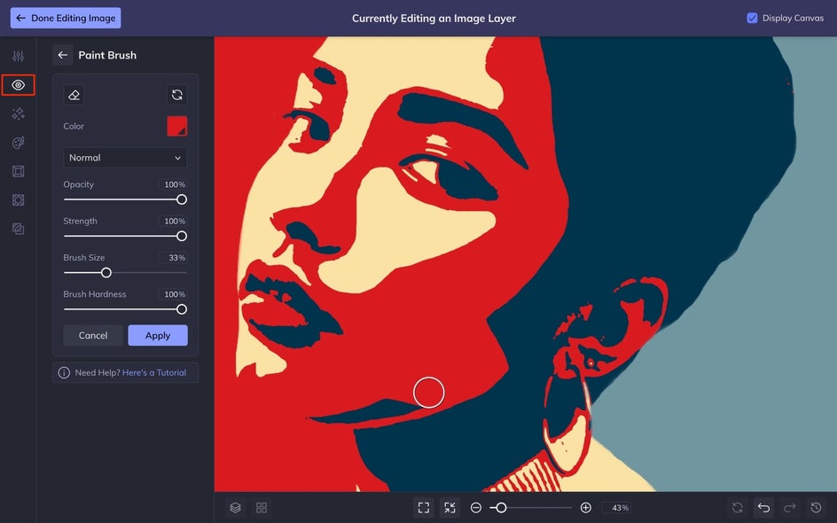 Next, if you want to smooth out the color blocking of your subject to mimic the original and blend more seamlessly, head to the Touch Up tab and select Paint Brush. Here, you can use the Eye Dropper Tool found under Color to copy the color of the section you wish to paint. Smooth those edges and fill in any blank space by using our assortment of brush options.