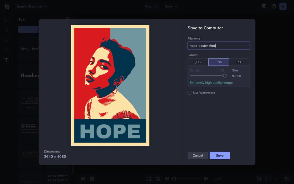 Last but not least, it’s time to save your poster so it’s ready to share with the world (or you know, your friends and family). Click Save at the top of the screen, then select your desired save location and format.