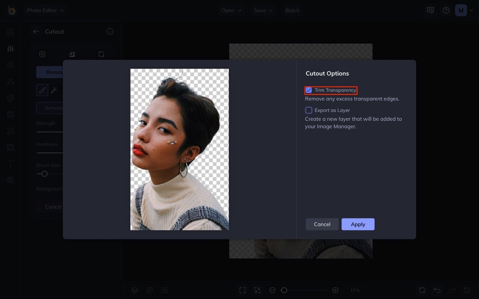 Once you're done, click Apply and check the Trim Transparency option to remove the edges of your image.