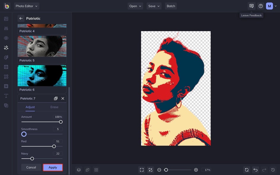 Next, we're going to add a Patriotic effect to achieve that Hope poster aesthetic. Head to the Effect tab and navigate to Patriotic. Then, click on Patriotic 7.