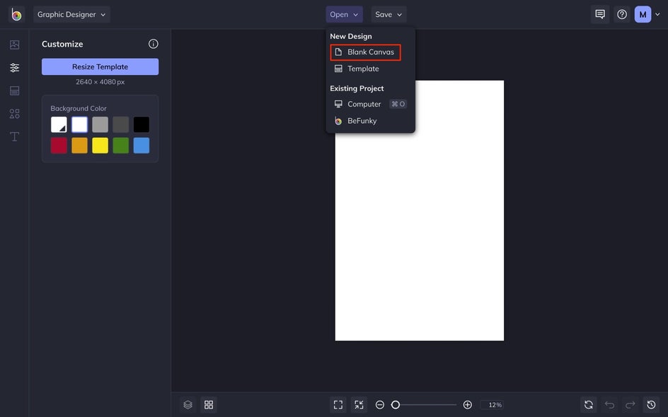 Once you're in the Designer, click the Open tab at the top of your canvas, followed by Blank Canvas. Then, select the 11x7 Poster option. Though feel free to create your design in any size you want.