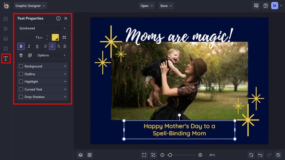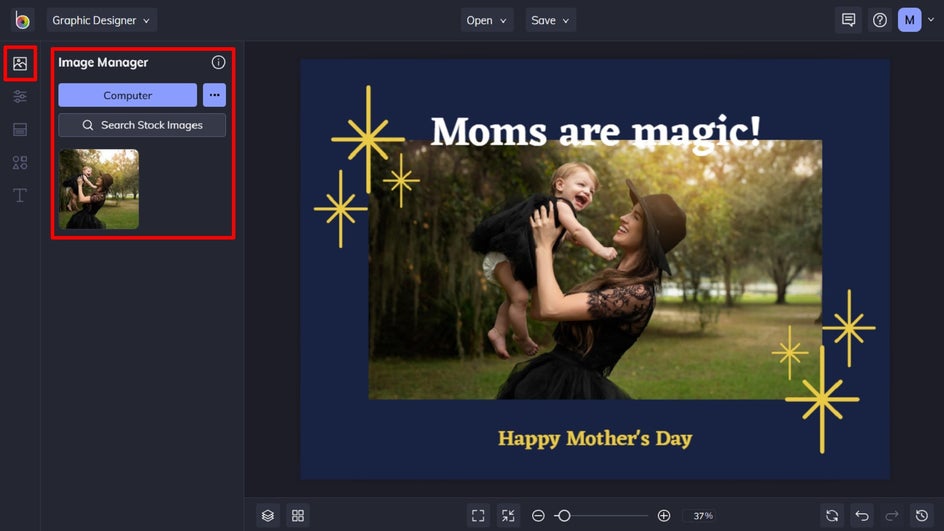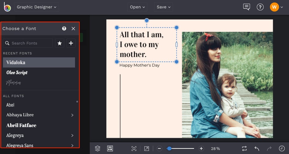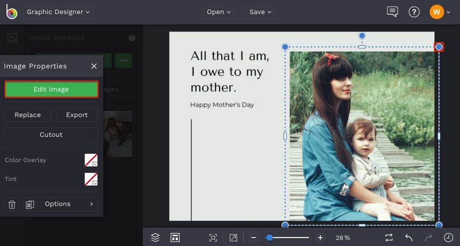 The first thing you’ll want to do is swap out the card’s existing photo for one featuring you and/or your mom. To do this, select the existing image with your mouse, then click Replace from the Image Properties panel. This will open your computer’s files, from which you can select your new image.