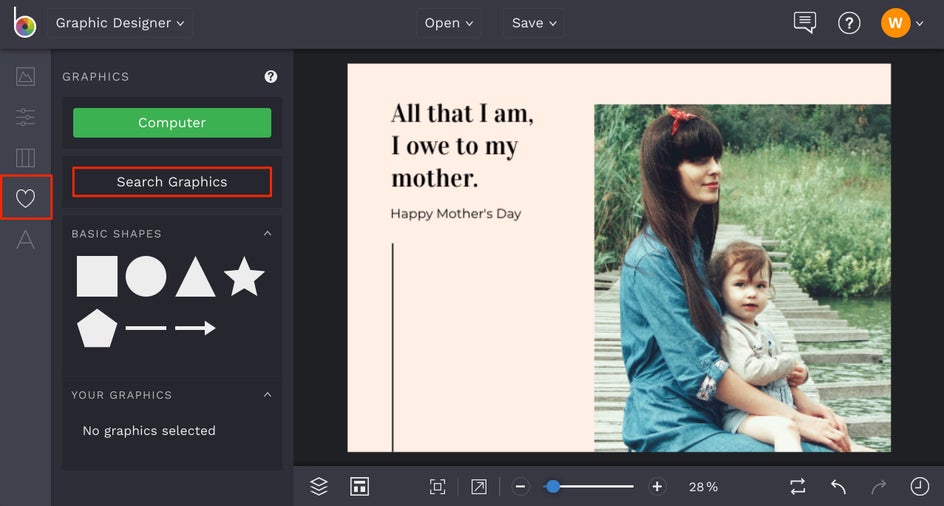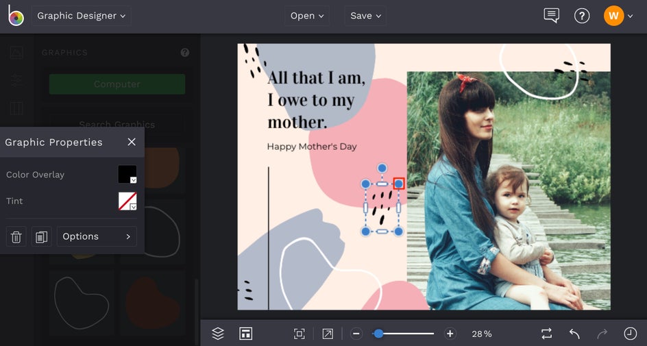 Not every Mother’s Day card has to contain a photo. If graphics are more mom’s thing, then a graphic-heavy card template will be perfect. You can use the background graphics we’ve provided, or switch it up by changing it out with something you love even more.