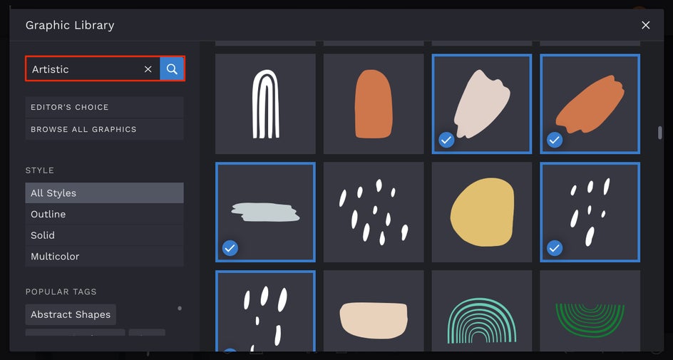 Once you’re in the Graphic Library, use the search bar to find all the graphics you need. Filter by style to narrow down your results or choose from popular tags and ‘Editor’s Choice’ to see what’s trending. Click on any results you love to instantly add them to the Your Graphics section of the Graphics tab. When you click the x in the top right corner (to close the Graphic Library) you’ll see all your picks there.