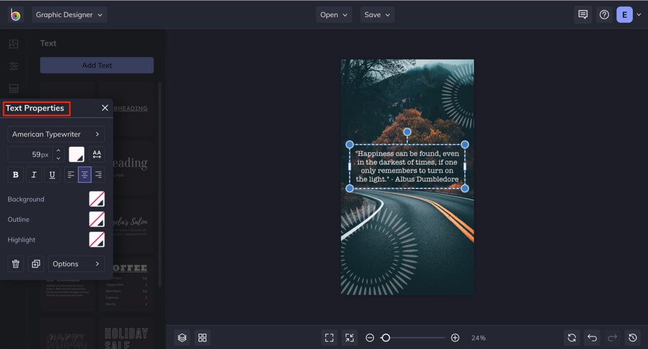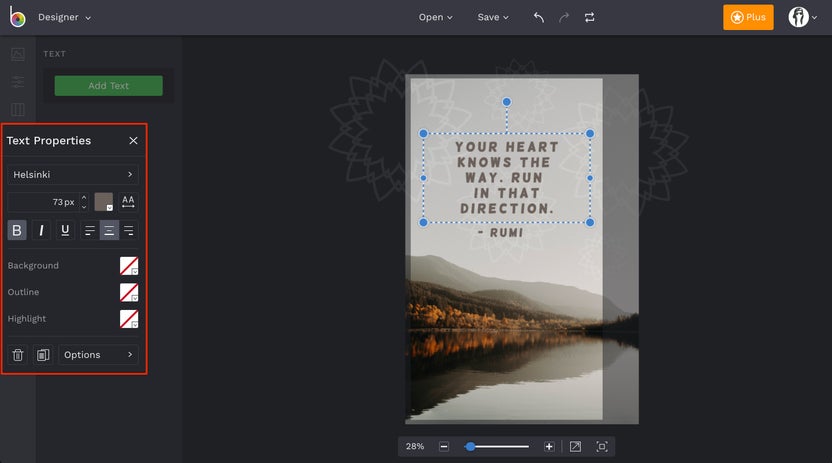 With your photo and graphic elements placed, select the Text tab, click the Add Text button, and type a quote or phrase you like into the textbox that appears. If you need any inspiration, try looking at quotes on Pinterest. From the Text Properties menu that pops up whenever your textbox is selected, choose a font that works with the look of your photo and play around with options like color, letter spacing, and more.