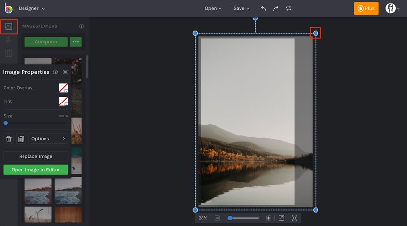 Just click the Search Stock Images button next to Computer, type in your search terms, and click on the results that appear to immediately add them to the Images/Layers tab. Any image that you add will appear as thumbnails that you can click and drag onto your template. Position and resize the photo(s) on your template using the blue circles around them
