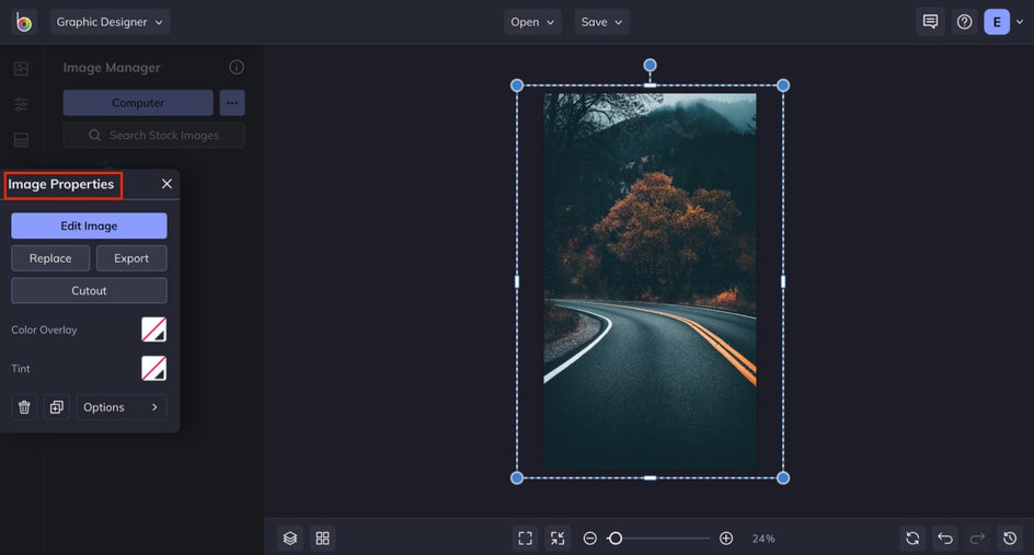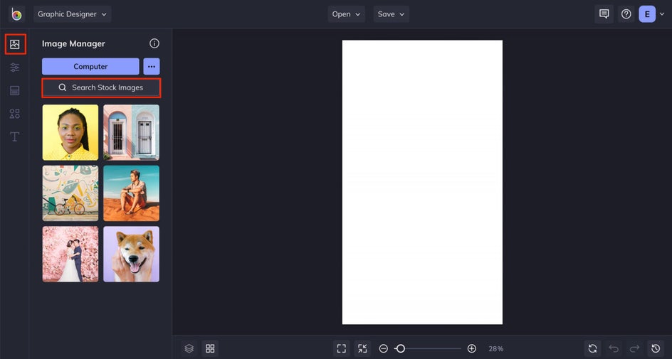 Click on the Image Manager tab and upload a photo by selecting the Computer button. If you have a creative vision in mind but don’t have a personal photo that you can use, the Image Manager tab also features the option to search over a million free stock photos, right from within BeFunky!