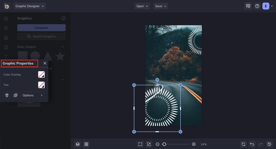 Once your background is looking perfect, open the Graphics tab and select a graphic that works with your photo. Using the Graphic Properties menu that appears when your graphic is selected on the template, try changing the color, blend mode, or opacity to manipulate the element to your benefit. Sometimes an element that might not be working just needs a different creative approach to make it fit in your piece.