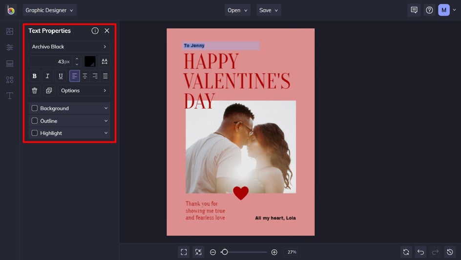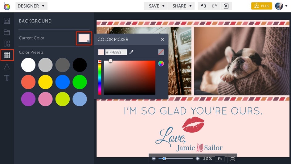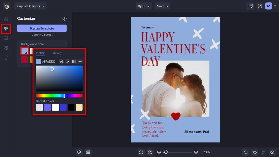 If you want to change the background color of your Valentine’s Card, navigate to Customize in the main menu on the left and select a color swatch of your choosing. Similarly, you can click on the first color swatch (the one with the dropdown arrow) to open the Color Picker, type in the color’s specific HEX Code, or use the Eye Dropper Tool.