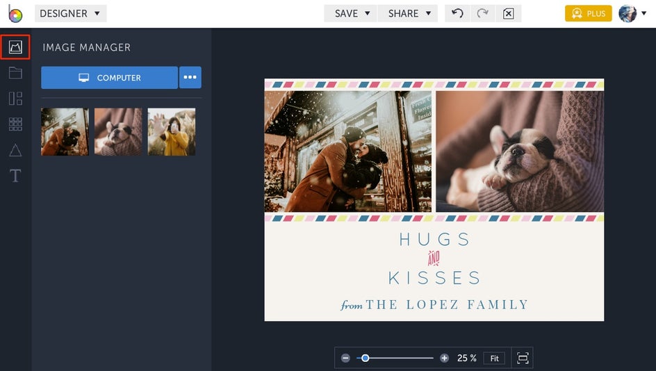 Next, you’ll want to swap your template’s existing photo or photos for one featuring you and your special someone. Navigate to the Image Manager from the main menu on the left, then click Computer to upload imagery from your own files. Alternatively, you can click the … button next to it to upload imagery from your BeFunky account, Facebook, or Google Photos.