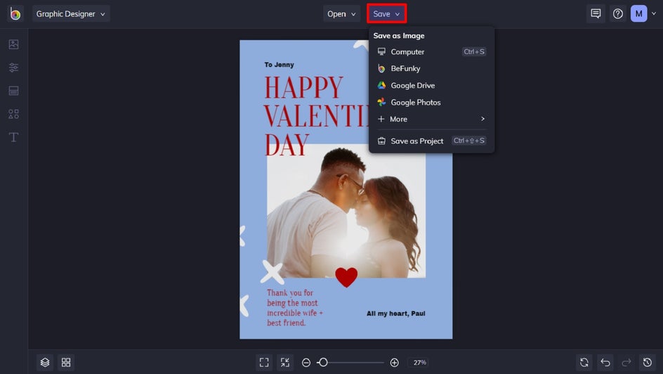 Once you’re happy with how your Valentine’s Day card looks, it’s time to save it. Click on Save at the top of the screen, followed by Computer. We recommend saving your design as a PDF file in Print quality, as this will save your design in the highest quality for printing.