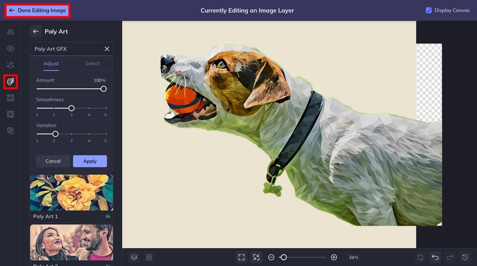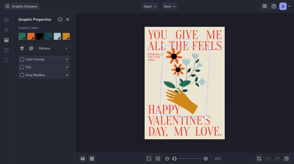 In addition to any photo effects, you can also experiment with graphics, frames, and other features of the Photo Editor. Apply a heart-shaped overlay, layer a rosy vignette, and more. Once you're done customizing, click Done Editing Image to head back to the Designer.