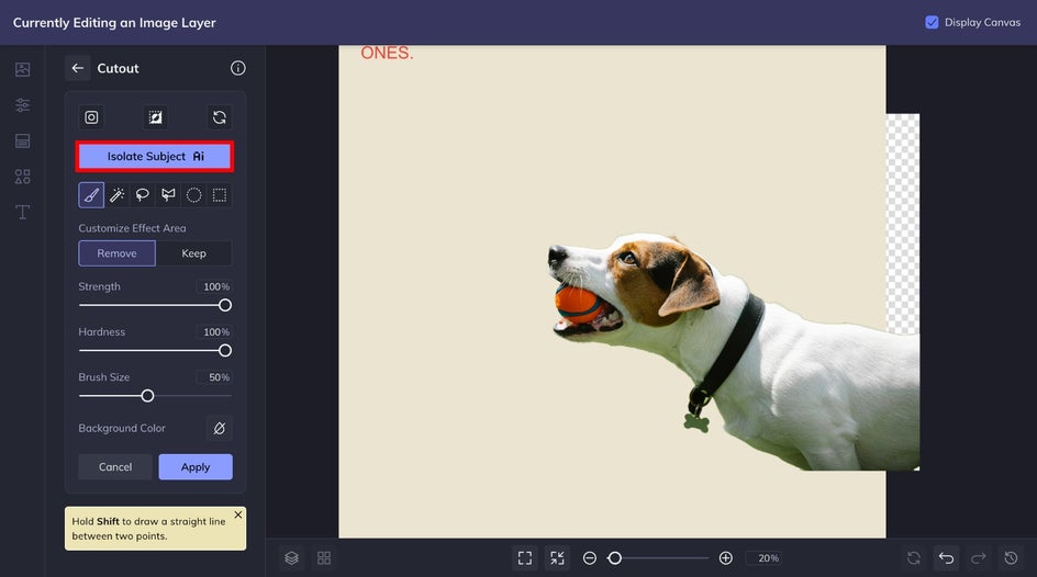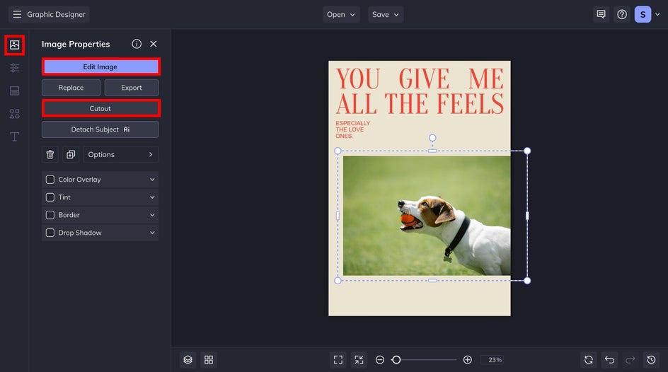 To upload your own photo, simply drag and drop it from your desktop onto the canvas. Alternatively, you can select a photo from your Image Manager. We want to customize our doggo with an Artsy effect, so we're going to direct our attention to the Image Properties menu.