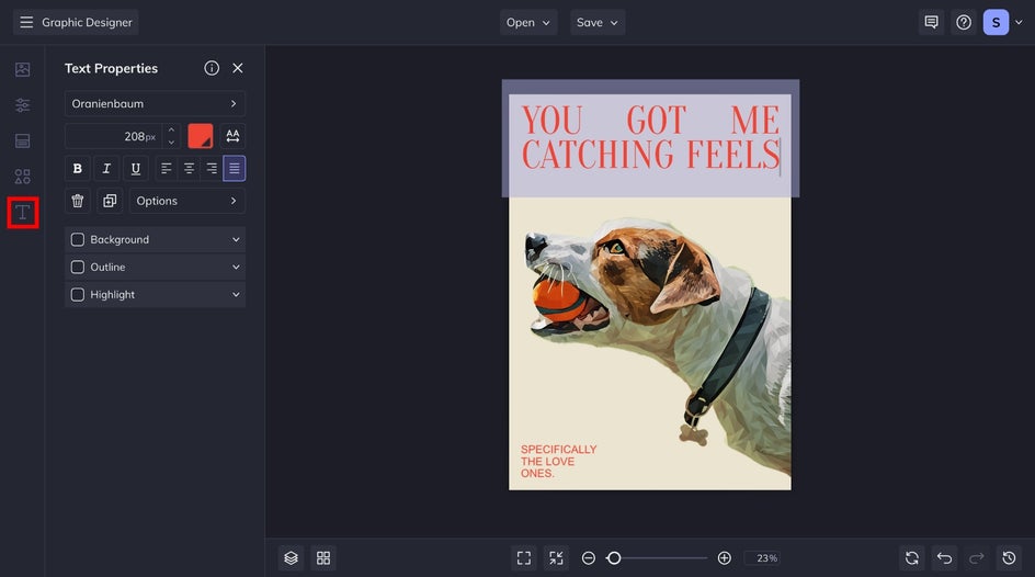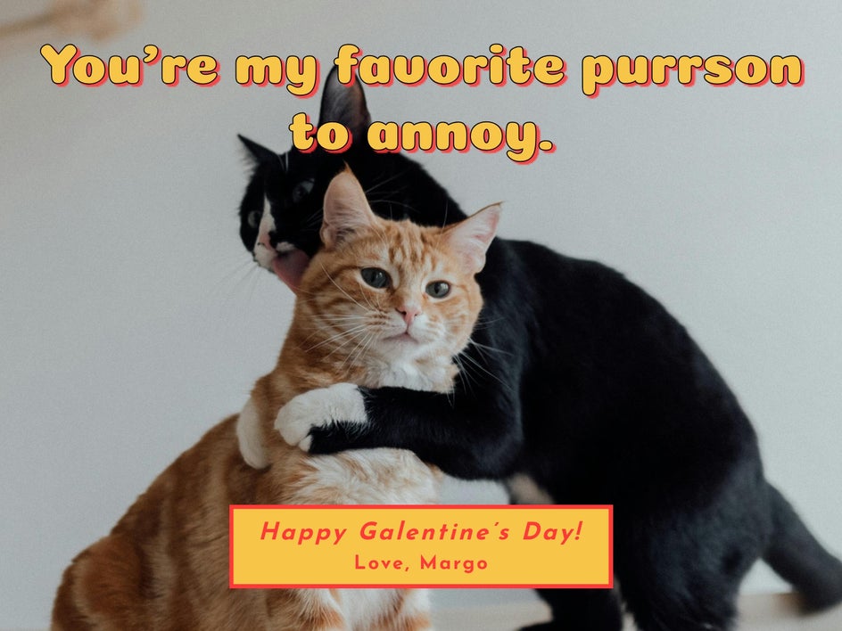 To customize the text of your card, simply click on a preexisting text box to open the Text Properties menu. Add heartfelt messages like “Purr-fect Valentine” or “You’ve Paw-sitively Stolen My Heart.”