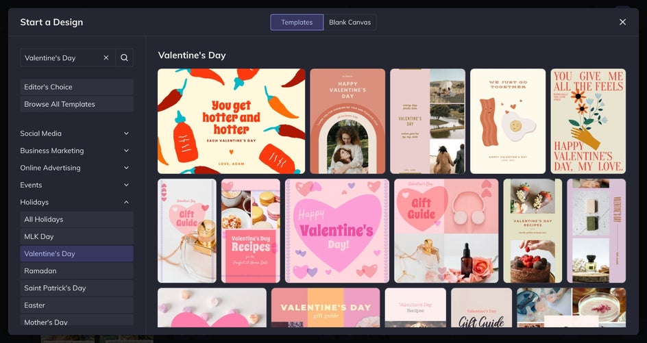 Open BeFunky’s Graphic Designer and select your favorite pre-made Valentine’s Day card template. You can find this category under Holidays or by typing "Valentine's Day" into the search bar. Click on a template to preview it and select Use This Template to get started.
