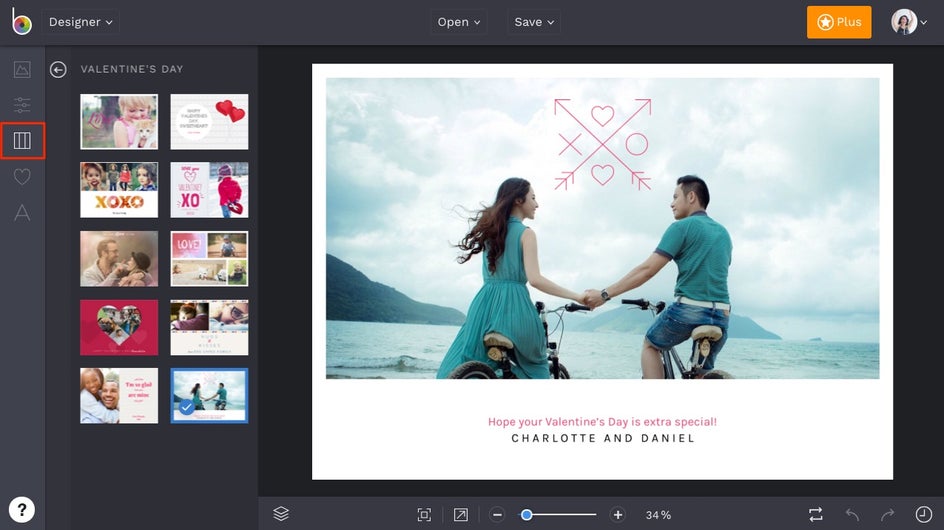 Once you’re ready to create your personalized Valentine’s Day card, it’s time to head to the Card Maker in BeFunky's Designer. To access the range of customizable card templates, navigate to Templates, followed by Greeting Cards, then Valentine’s Day. From here, you can select your desired template, ready to tweak it for your special someone!