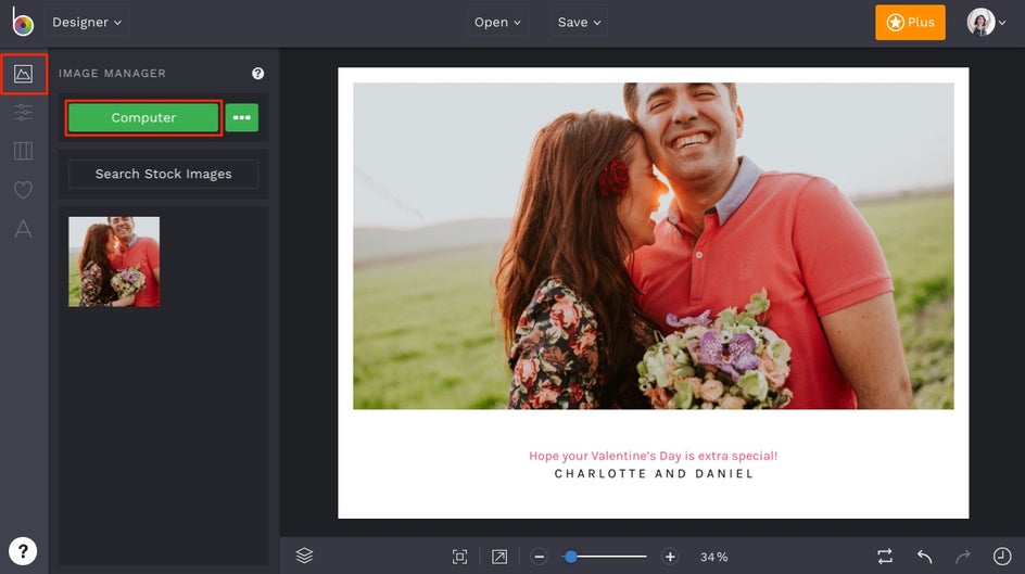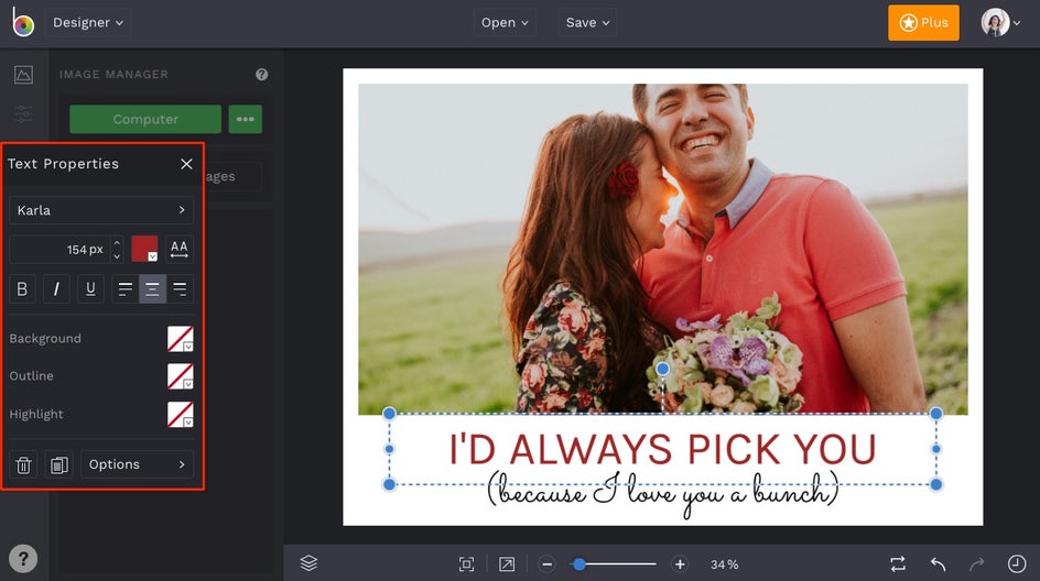 First up, you’ll want to change the template’s existing photo to one of you and your loved one (or any other cute graphic you had in mind). To do this, just click on the photo you want to swap and an Image Properties toolbar appears. From here, you can click on Replace Image, allowing you to upload one from your very own files. Alternatively, you can insert one of your own images by navigating to Image Manager in the left-hand menu (the first icon). This lets you upload a photo from your Computer, or other destinations such as BeFunky or Facebook.