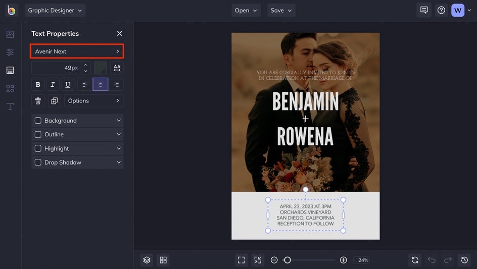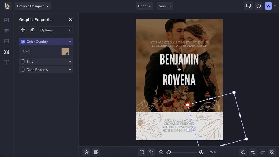 Once you’ve got the basics down, the fun really begins. BeFunky’s creative tools make it easy to go beyond the template and add your own flair. Whether you want something artistic, bold, or effortlessly chic, here are a few ways to personalize the wedding invitations and make them feel one of a kind.