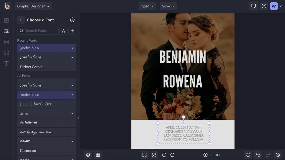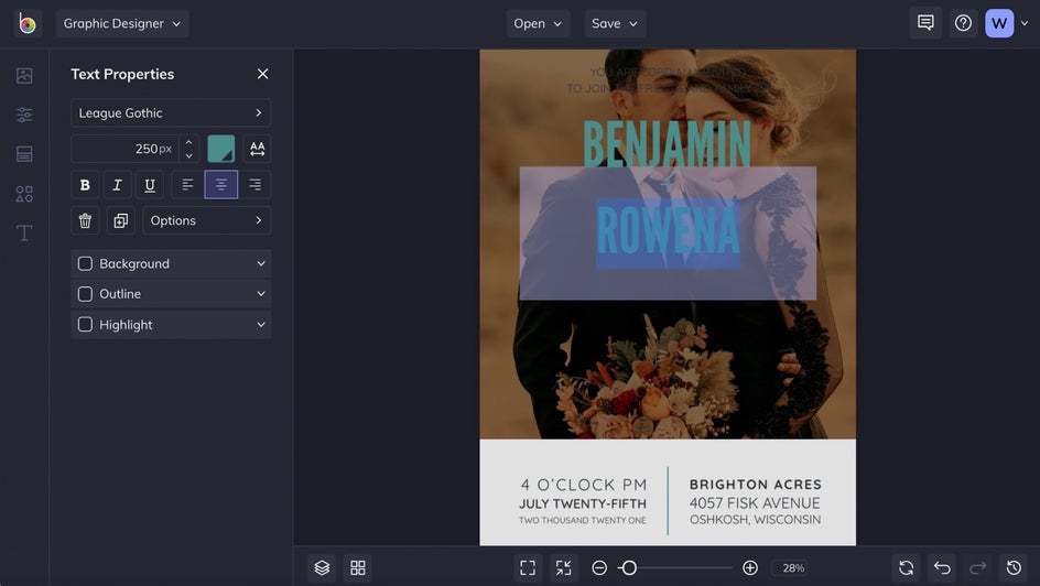 With BeFunky, you can access a library of free wedding templates and design tools that allows for fully customize invites. Whether printed at home, ordered through a local printer, or sent digitally via email or text, the final cost stays completely in control.