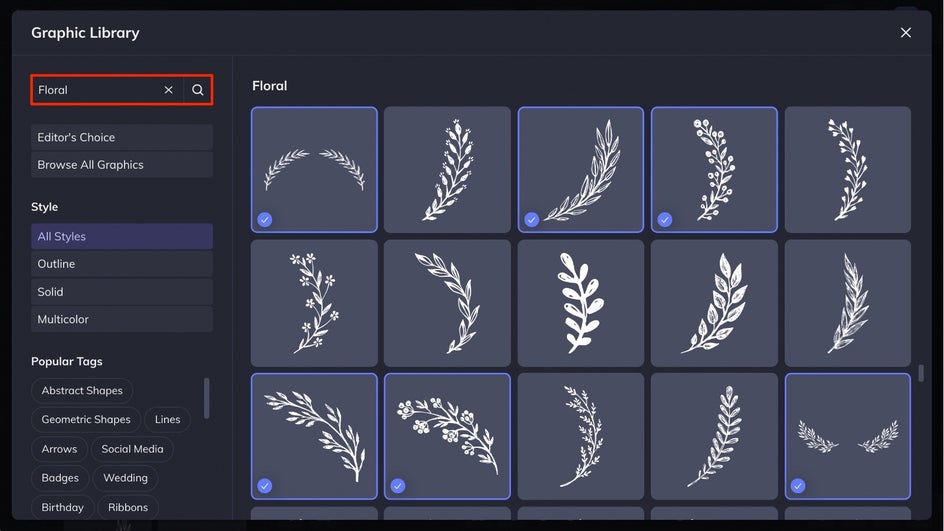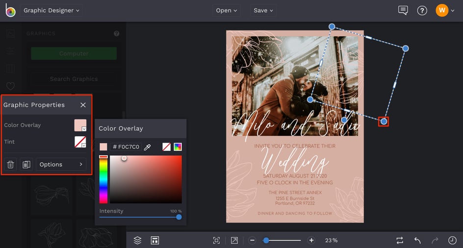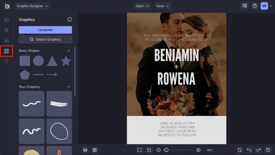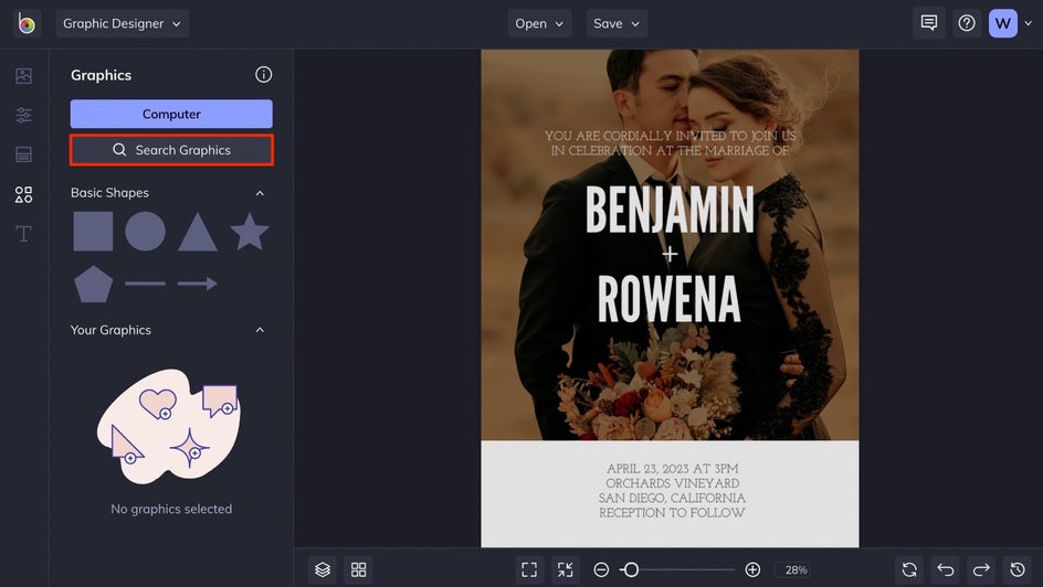 Don’t forget to explore the Graphics tab! Search the Graphics Library for illustrations that complement the selected theme, like florals, hearts, rings, or even custom icons representing your relationship. Once selected, graphics can be resized, rotated, and layered anywhere on the design. Simply drag and drop the saved graphics over to your canvas and place them where you desire.