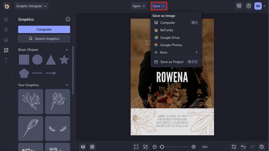 When you’re happy with the design, hit the Save button at the top of the canvas. Save as a high-quality PDF if you’re printing, or as a PNG or JPEG for digital sharing. You can also save the design as a project file in BeFunky so easy edits can be made later! This is perfect for creating coordinating pieces like RSVP cards, save-the-dates, or thank-you notes.