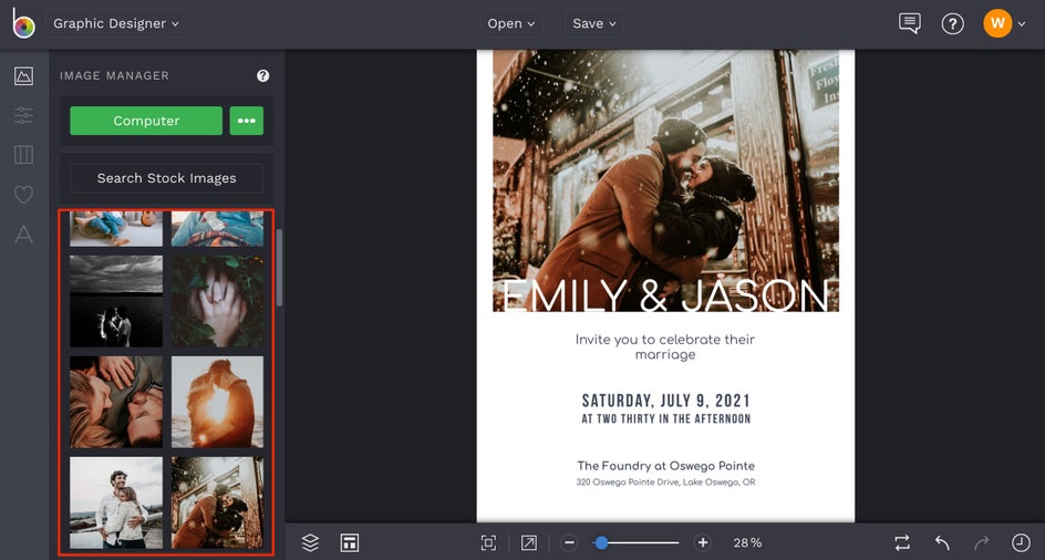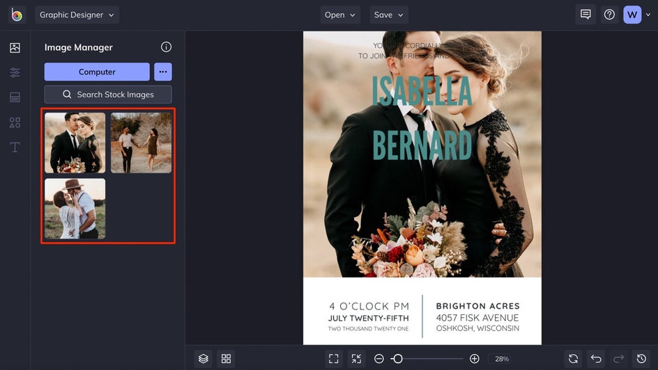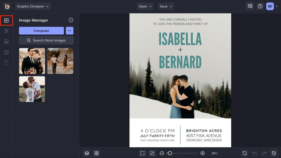 To add or replace a photo on the invitation, open the Image Manager from the left-hand menu. Click the Computer button to upload any images you’d like to use. Once uploaded, the images will appear as thumbnails. Just click and drag one over an existing photo on the template to swap it in.