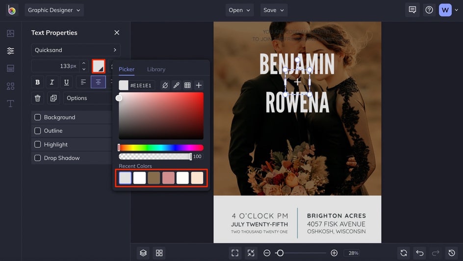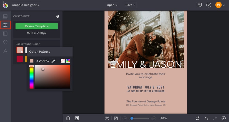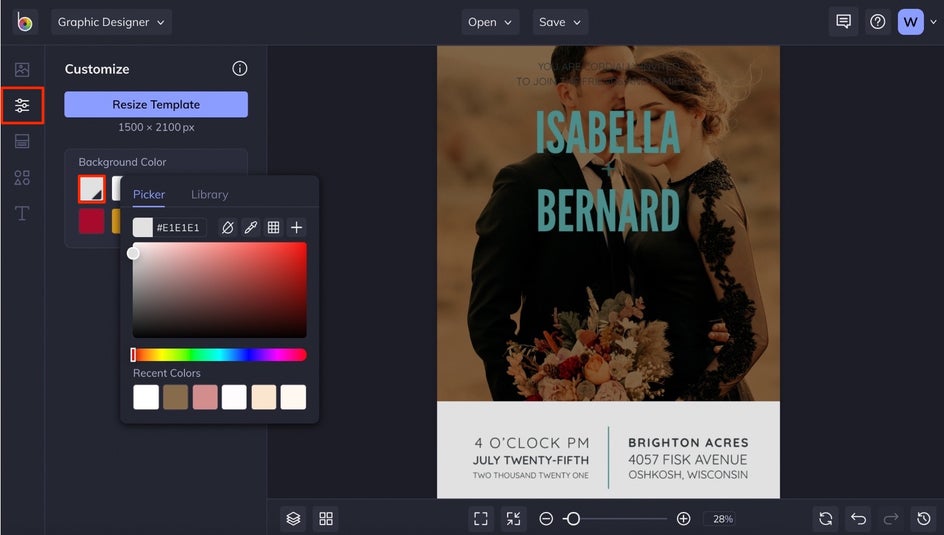 Want to match your wedding’s aesthetic? Go to the Customize tab and change the background color using the color picker or type in the exact HEX code. For example, you might use a bridesmaid dress swatch to create a perfectly coordinated palette.