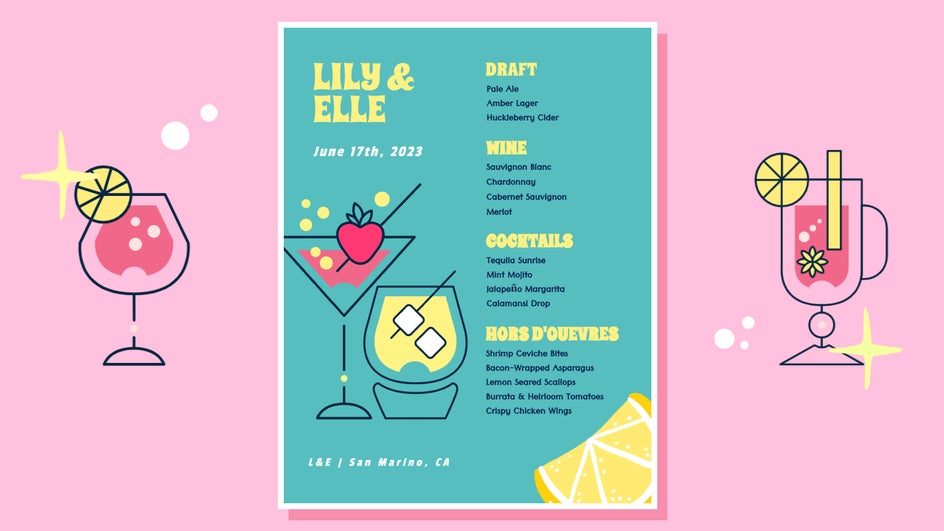 Our tutorial focused on a traditional three-course menu for an elegant springtime wedding. But if that’s not the vibe you’re going for at your wedding, no problem! With dozens of templates and endless customization options, you can design the exact menu card you’re looking for while still making room in the budget. Here’s some wedding menu inspiration to get your creativity flowing!