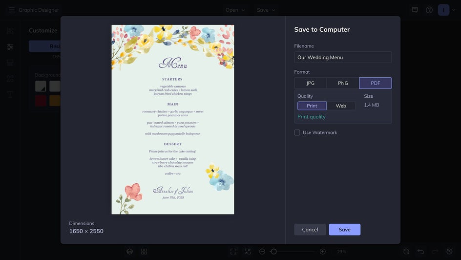 The final step is to save your menu card. To make sure it prints at its highest quality, you should save it to your computer as a high-quality PDF. Now you can print your wedding menu at home directly from your computer, or send the file to a local shop for printing!