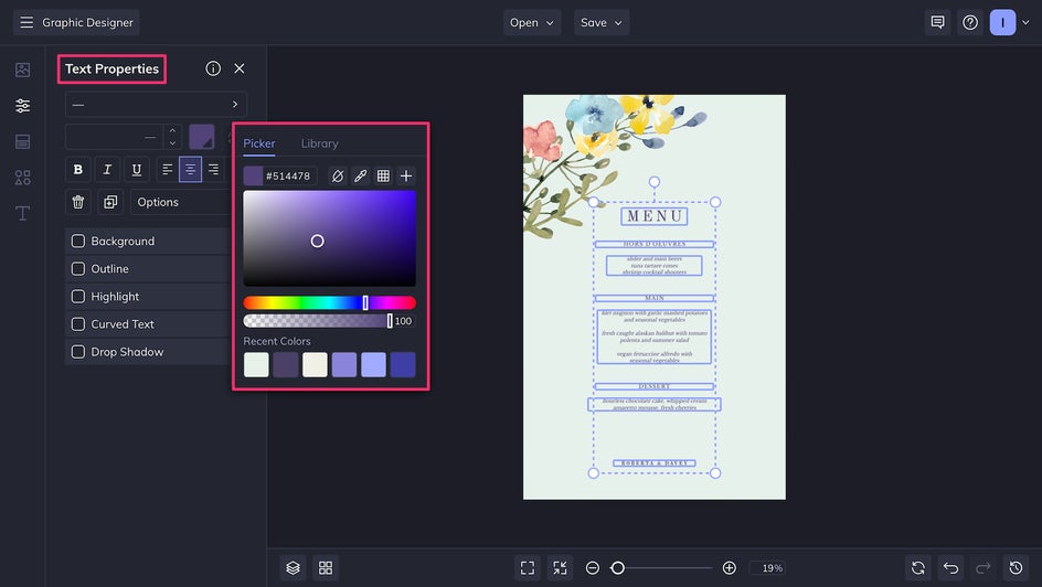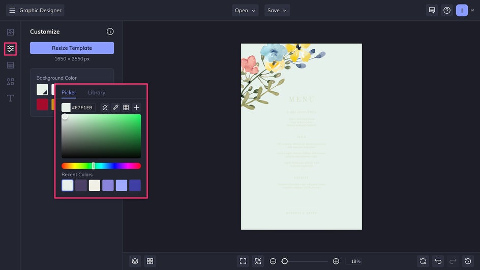 Replacing the colors of your template is a breeze. To adjust the background color, just click the Customize tab and use the color picker. If you’d like to resize your wedding menu card, you can also do that here!