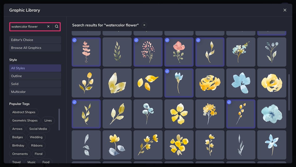 Searching “watercolor flowers” gives us some matching graphics that will go perfectly with the rest of our design.