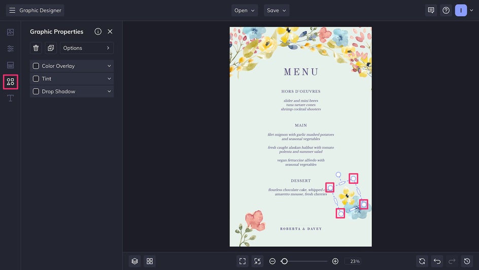 For this wedding menu, we don’t need to alter the color of the graphics, but you can always do that as well – just click the graphic you want to change and use the Color Overlay or Tint feature.