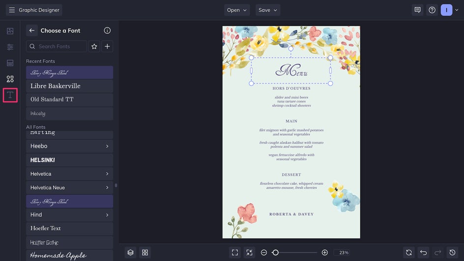 Changing the template’s default fonts is a great way to add more personality to your wedding menu card. For a slightly more elevated look, we decided to use a cursive script for the header and the couple's names. We left the rest as is because this serif already has the perfect understated elegance – plus it’s easy to read, which is critical in a menu.