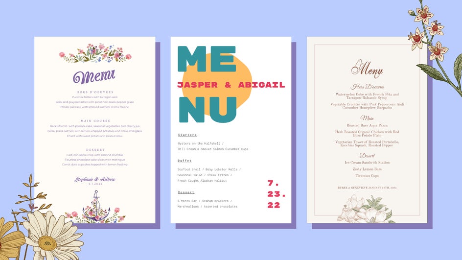 The Graphic Designer has dozens of menu templates for you to choose from. Just type “Menu” or “Wedding Menu” into the search bar and scroll through the options to pick your favorite!