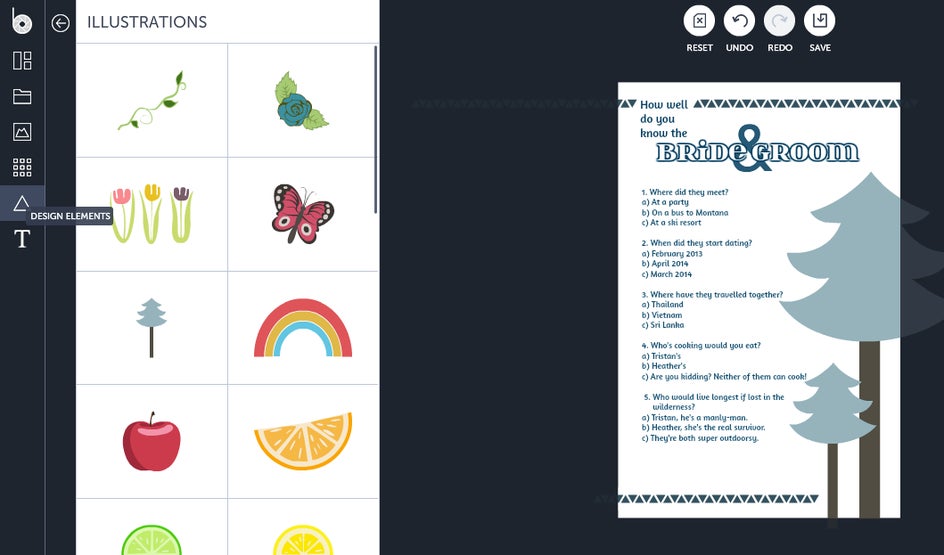 Then, I got to do the really fun part and decorate this bad-boy. My brother and his lovely wife-to-be are quite outdoorsy and the wedding is going to be in the mountains, so I add a mountain-like line using the Design Elements graphics. Again, I used the Color Picker to match the color.
