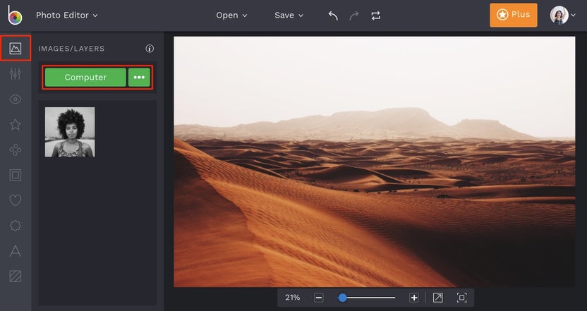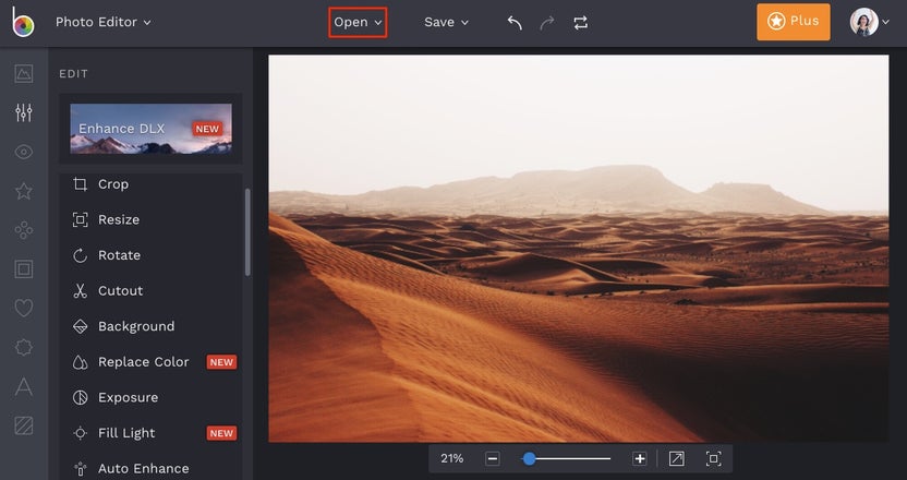 For this tutorial, we will be creating a double exposure image using the Photo Editor. First, select your image for the background. When you are choosing a background image, keep in mind that you will want something that has a lot of contrast. That way, when the overlay image is added, the end result will be more pronounced. You can open the photo you want to use as the background for your image by dragging and dropping it onto the canvas or by clicking the Open tab.
