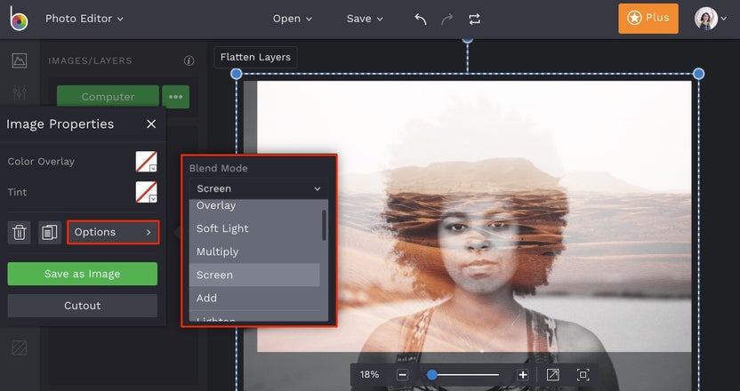 With the top image layer selected, click on the Options tab, followed by Blend Mode. To create the quintessential double exposure image, the best blend modes to use are Screen, Overlay, or Lighten. For this tutorial, we will use the Lighten blend mode.