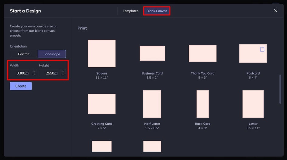 Click Blank Canvas at the top of the screen, then select your desired canvas shape from the options available. Alternatively, you can type your chosen dimensions into the Width and Height sections within the sidebar.