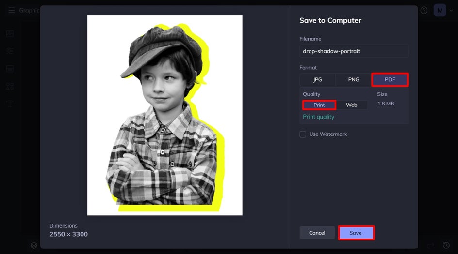 Finally, all that’s left to do is to save your new DIY drop shadow portrait. Click Save at the top of the screen, then select your save location and file type.