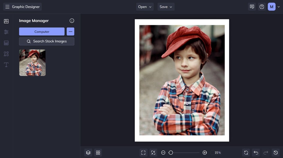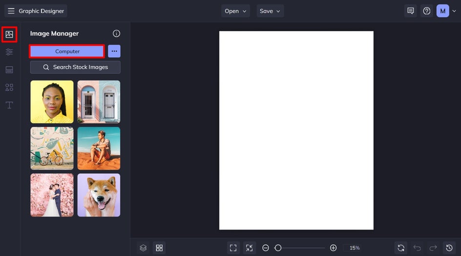 To add your photo to your blank canvas, navigate to Image Manager in the main menu on the left. Then, click Computer to upload your photo from your own files.