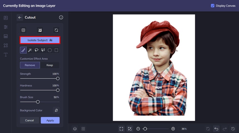 Within the Cutout menu, simply click the Isolate Subject button to remove your portrait's background in a single click using AI technology.