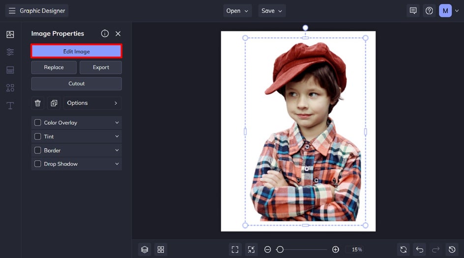To remove the background from your portrait, select it with your cursor. Then, from the Image Properties panel which appears, click Cutout.