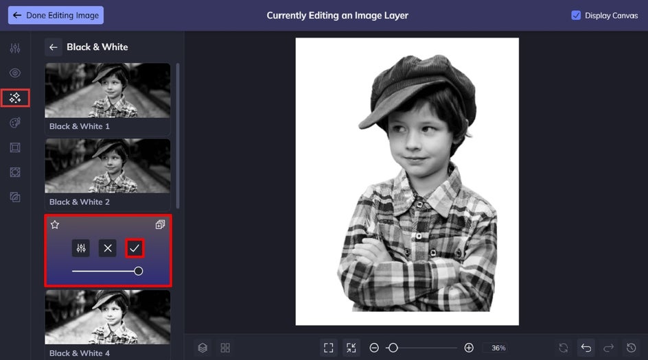 Click on an effect to sample it on your portrait. You can also adjust the strength of the effect using the corresponding slider. When you’re happy with your chosen effect, just click the checkmark button to apply. Then, click Done Editing Image in the top-left of the screen to return to the Graphic Designer.