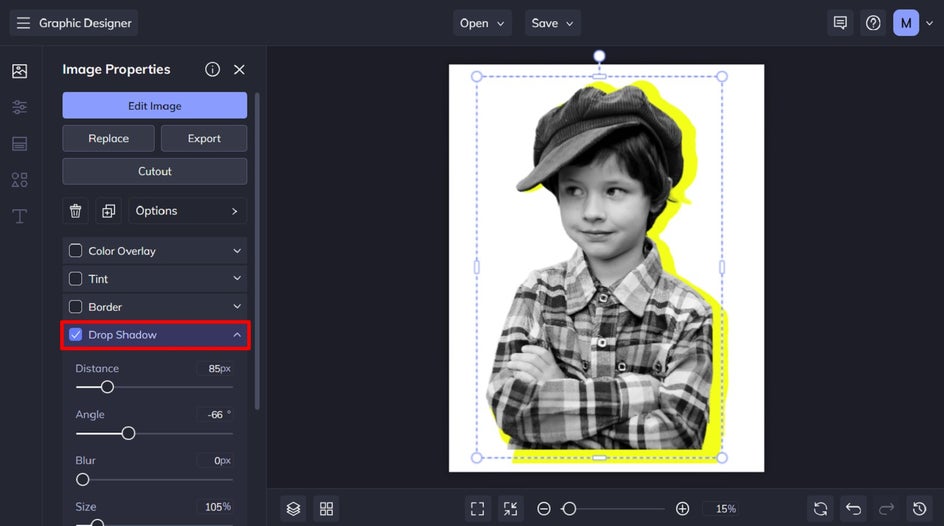 The Drop Shadow option is also located within the Image Properties panel. Select the checkbox located next to Drop Shadow, then adjust the settings to create the look you had in mind. For this example, we’ve chosen a bright yellow color, but you can select any color you desire from the Color Picker.