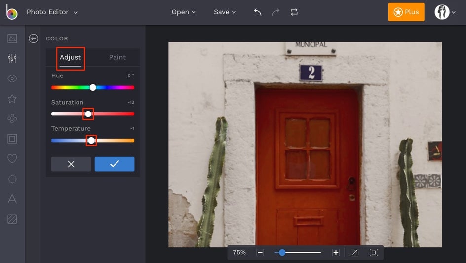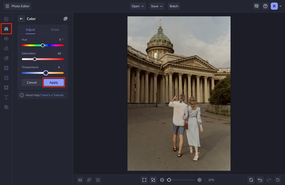 Once here, select Color. While the temptation to increase the Saturation and Temperature slider might be real, you'll want to decrease the Saturation slider by 10-20 and increase the Temperature slider by only about 5-10 to the warmer side. The temperature slider should not be heavily relied on here. When you’ve made the edits, click Apply.