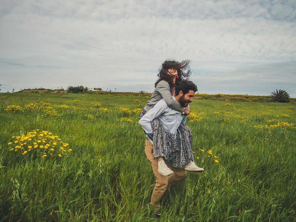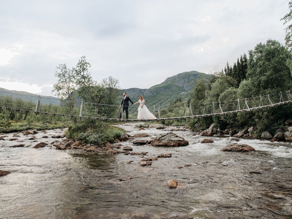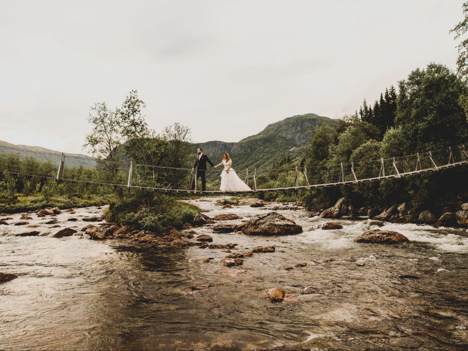 Take these photos, for example. We edited the original to bring out the neutral earth tones from the background, skin tones, and outfits. The use of brown from the landscape and skin tones and the dusty bluish-grey from the sky pull a romantic, warm tone into the background and foreground, while the whites and brights are neutralized and softened.