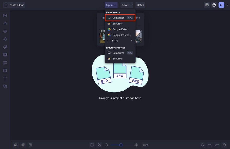 To get the process started, head to BeFunky’s Photo Editor and upload the photo you want to edit by selecting the file from the Open tab or simply dragging and dropping the image directly into the interface.