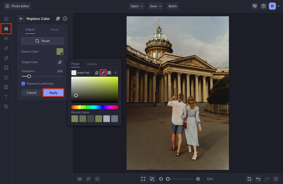 First, select your Source Color. Use the Eye Dropper tool to select the color in your image that you want to desaturate. Once you have this selected, drag the Tolerance slider all the way down to the left and increase it slowly. You want to try to choose a tolerance that includes the most amount of your color, without affecting the rest of your image. You will notice that if you bump it up too high, you affect more of the photo. Adjust this to the left until you are just affecting the color you intend to change. Once you have done this, select Apply.